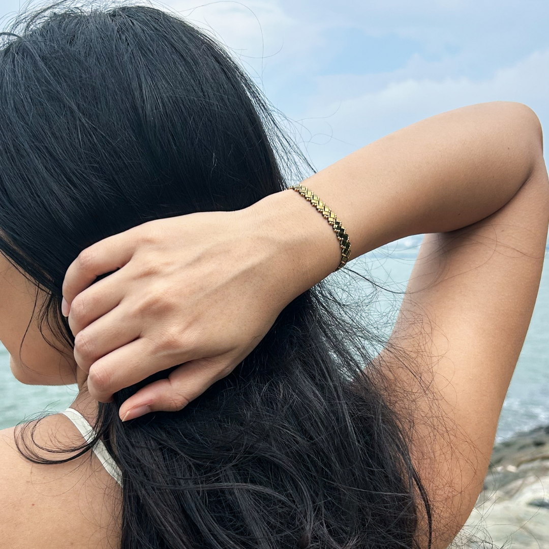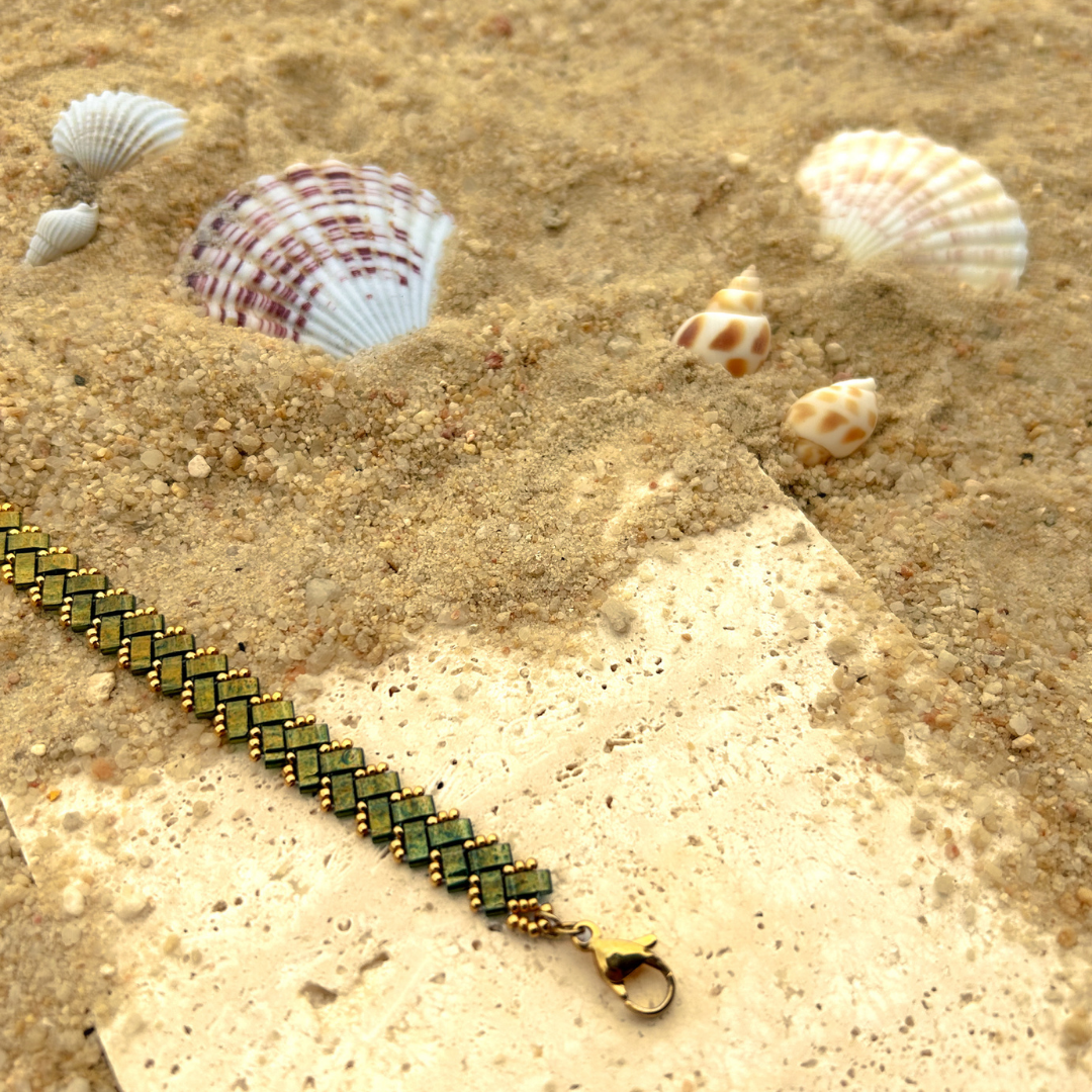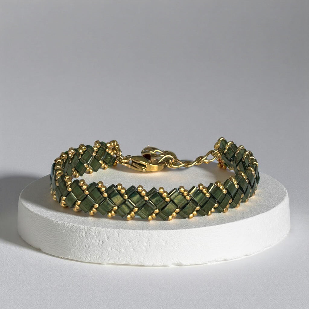 Your beadwoven jewelry is crafted from countless tiny, high-quality glass beads, sewn together. To keep it in pristine condition, handle it with care, avoid contact with hard surfaces, and gently wipe it with a non-alcohol wipe or a jewelry cloth to maintain its shine.