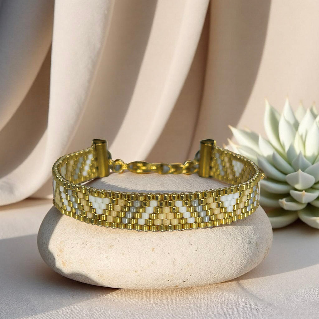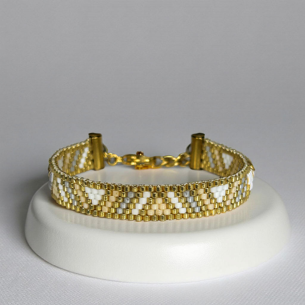 Your beadwoven jewelry is crafted from countless tiny, high-quality glass beads, sewn together. To keep it in pristine condition, handle it with care, avoid contact with hard surfaces, and gently wipe it with a non-alcohol wipe or a jewelry cloth to maintain its shine.