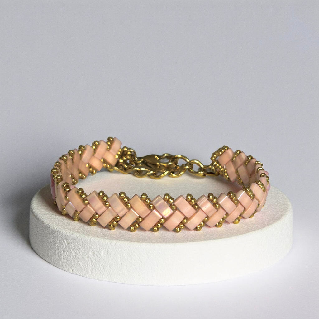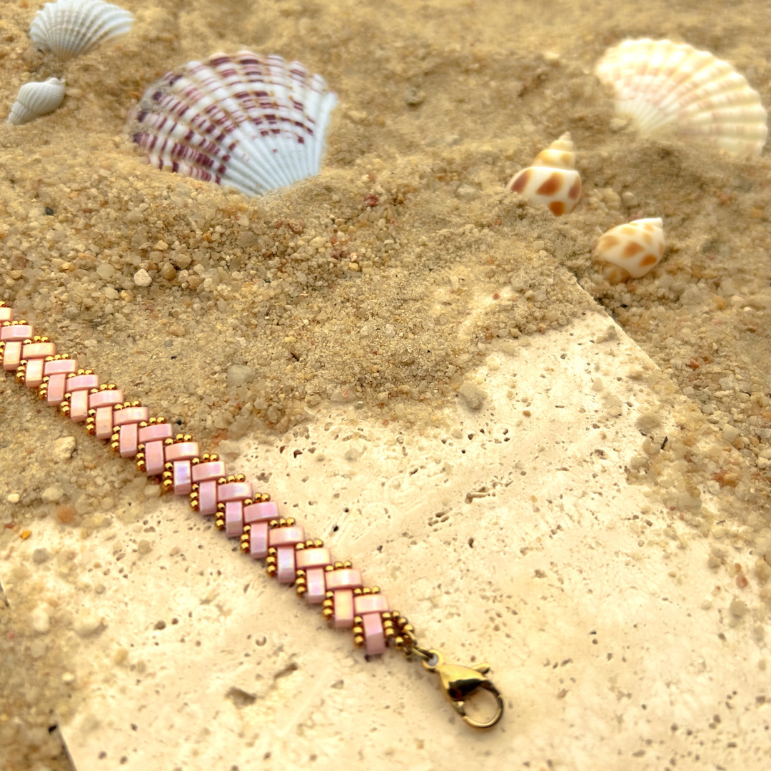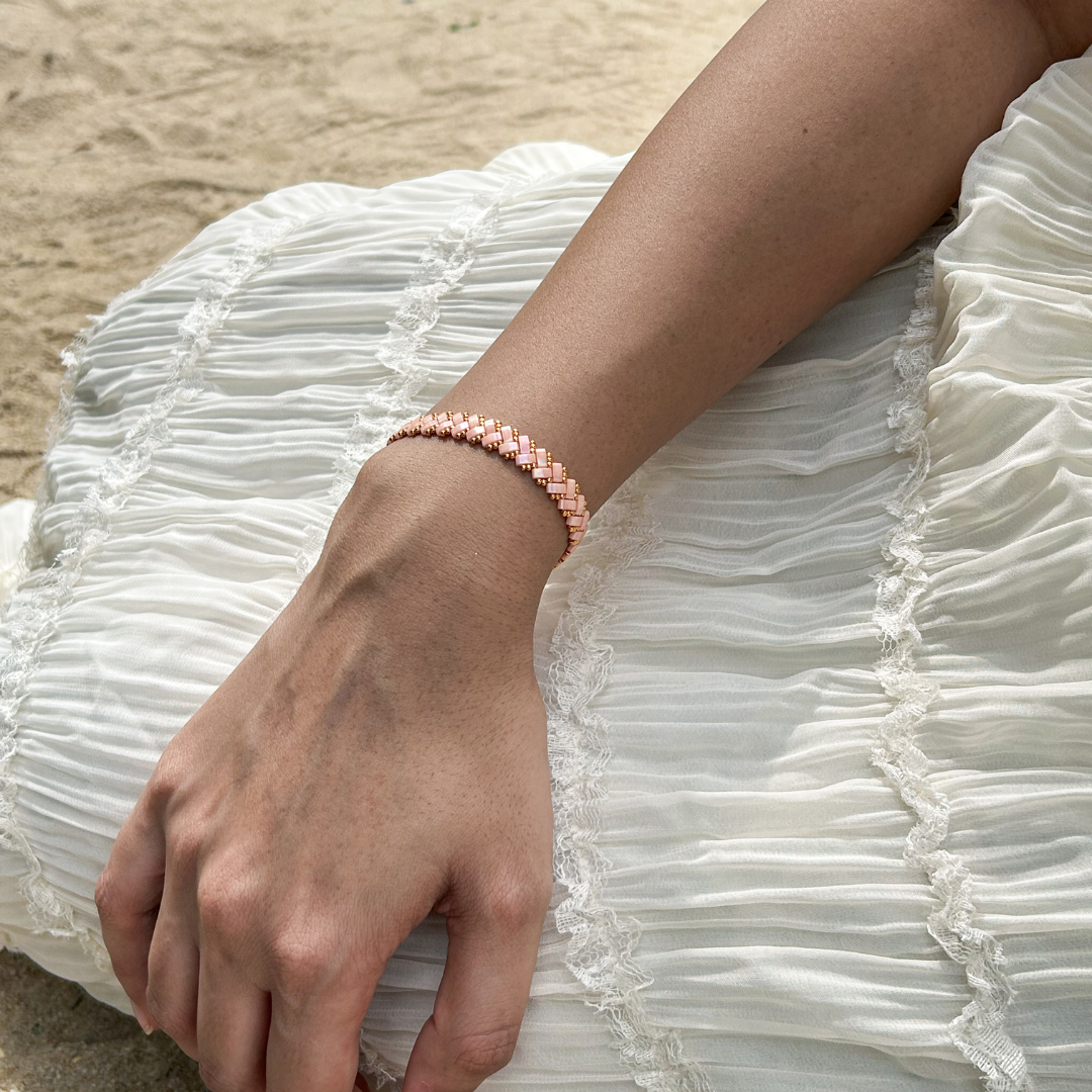 The Pink Oasis bracelet features soft pink hues that evoke the calm and warmth of a setting sun. Its serene tone adds a peaceful yet vibrant touch to any outfit.