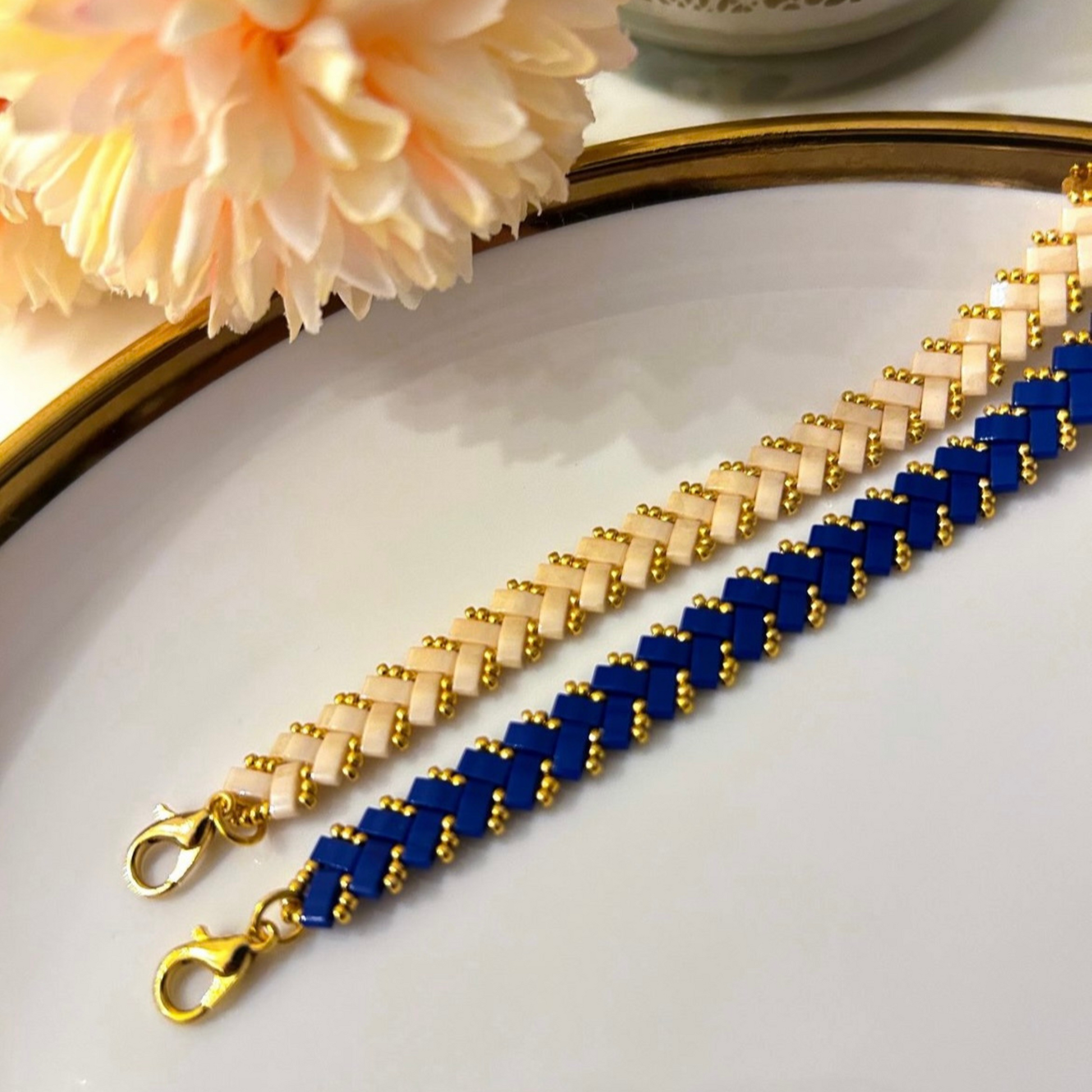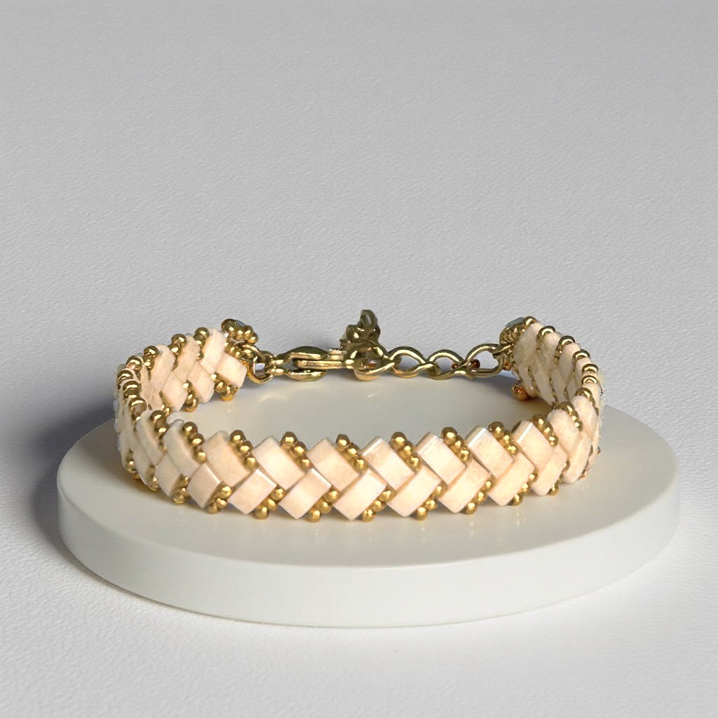 Your beadwoven jewelry is crafted from countless tiny, high-quality glass beads, sewn together. To keep it in pristine condition, handle it with care, avoid contact with hard surfaces, and gently wipe it with a non-alcohol wipe or a jewelry cloth to maintain its shine.