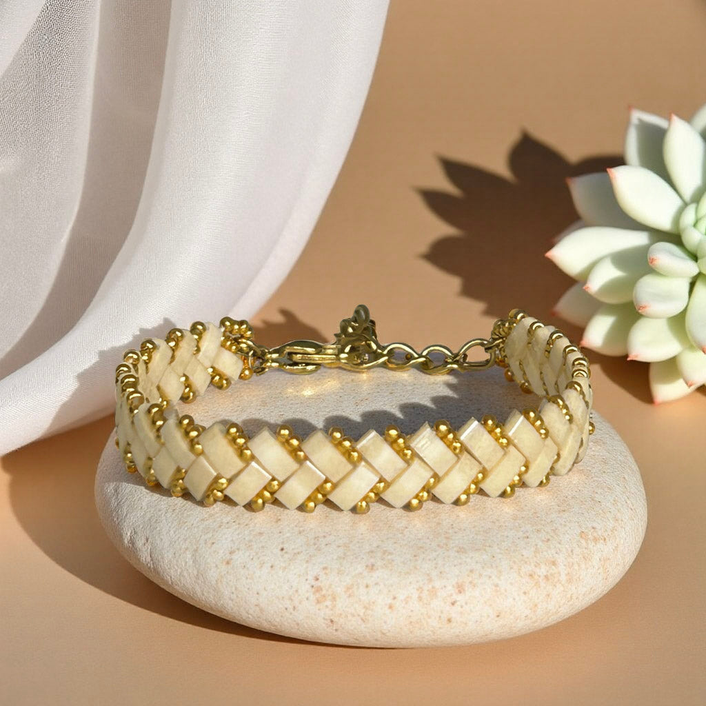 Ganda Beaded Bracelet is a beige color bracelet made of high-quality white gold beads, ensuring a durable and stylish piece of jewelry.