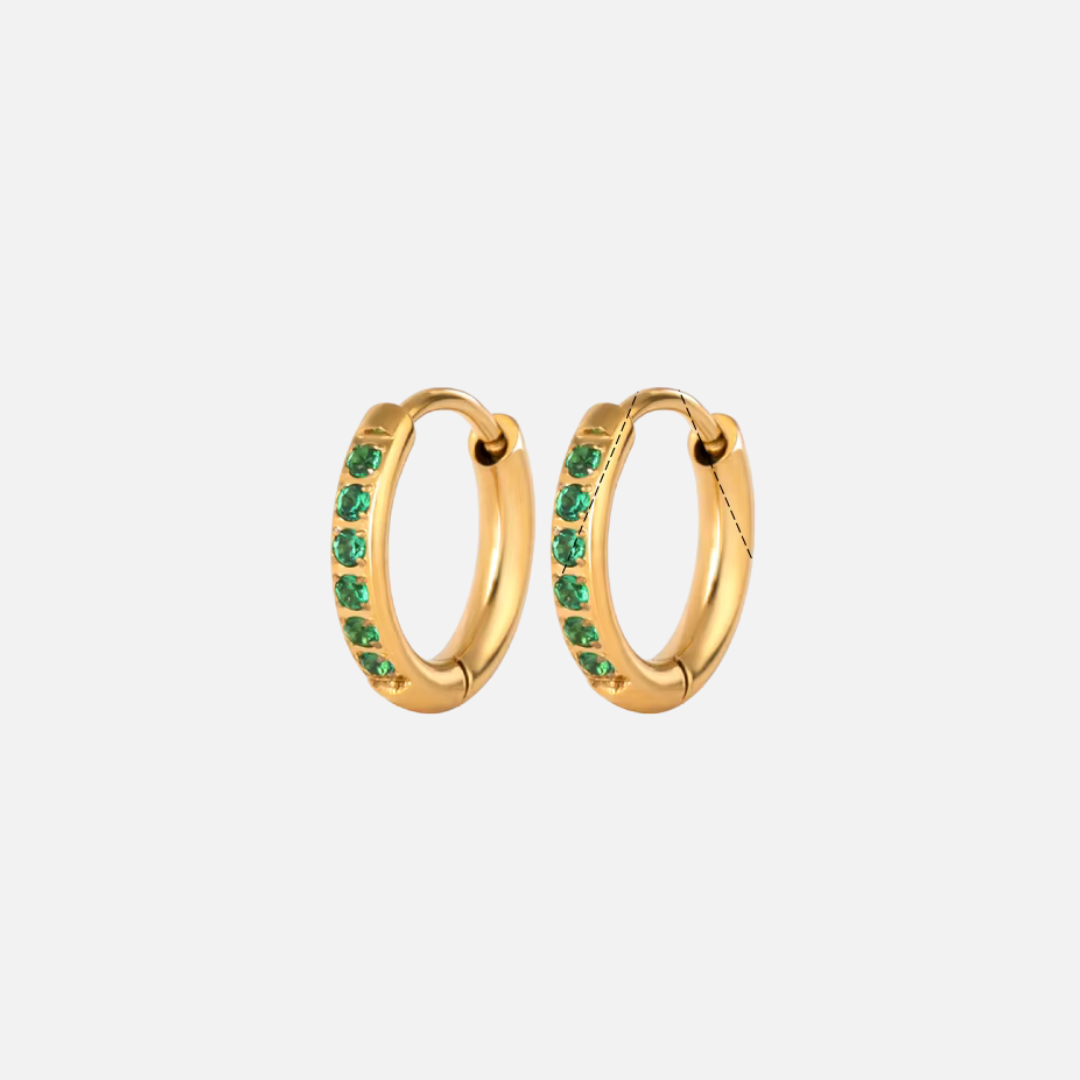 The Gold Green Mini Hoop Earrings blend the classic charm of gold with the refreshing touch of green, offering a pop of color in a sleek, compact design. Ideal for adding a subtle yet stylish flair to any look.