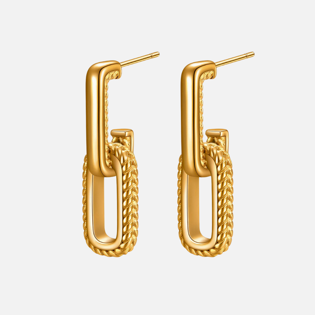 Sleek and sculptural, these gold earrings feature two interlocking rectangles for a modern, geometric look. A refined statement piece that adds a touch of edge and sophistication to any outfit.
