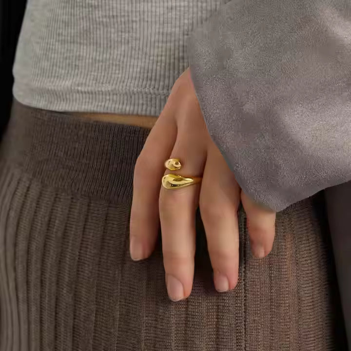 Bold and fluid, this chunky gold ring features a sculptural water drop design that adds a modern, organic touch to your stack. Its high-shine finish and curved silhouette make it the perfect statement piece for elevating any outfit.