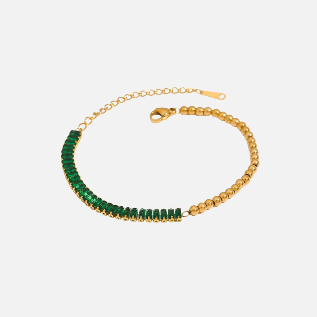 Playful yet sophisticated, the Green Ball Bracelet blends luminous green stones with polished gold ball details. A unique half-and-half design that’s perfect for mixing, matching, and making a statement.
