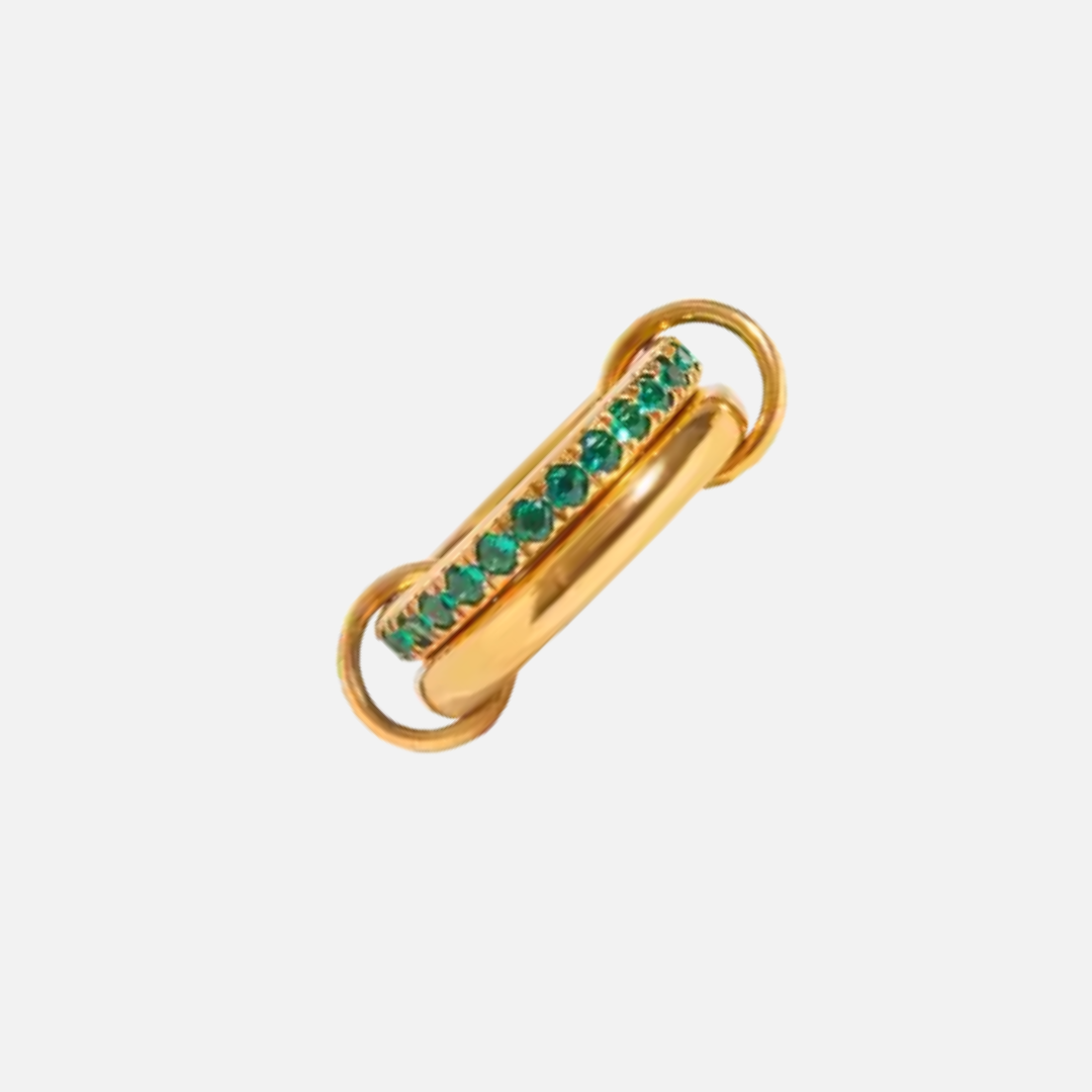 This unique double-band ring features two parallel bands—one in polished gold, the other lined with vibrant green crystals—joined together by small connecting loops at each end. The structured yet delicate design adds a bold pop of color while maintaining a sleek, modern feel.