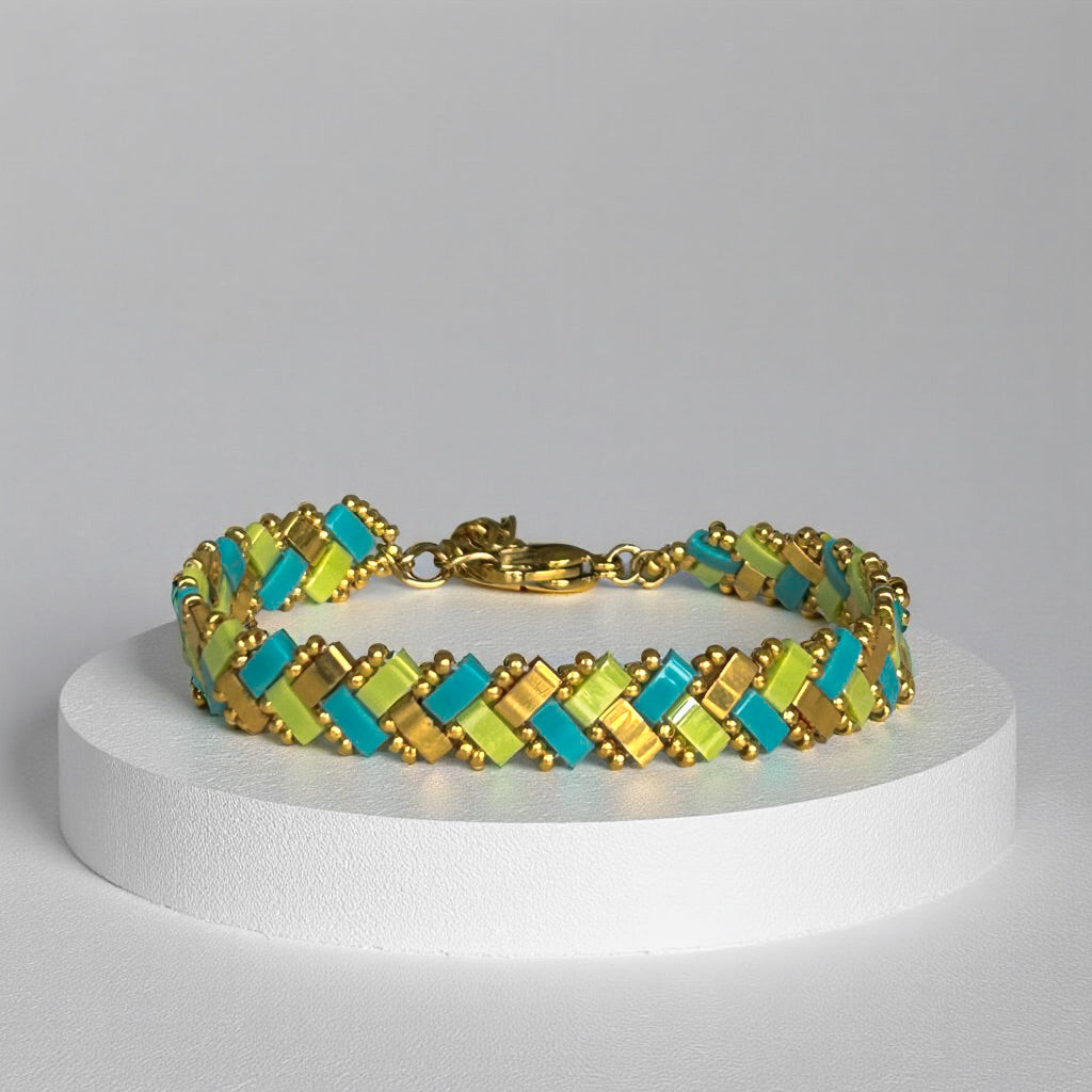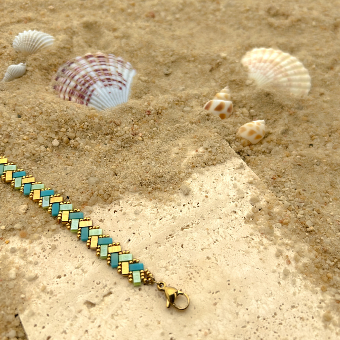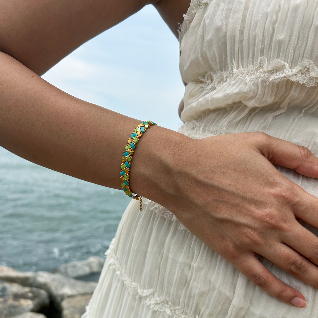 The Mombasa Beaded Bracelet features a serene mix of blue and green hues accented with gold, capturing the essence of nature with a hint of luxe—perfect for adding a refreshing and elegant touch to any outfit.