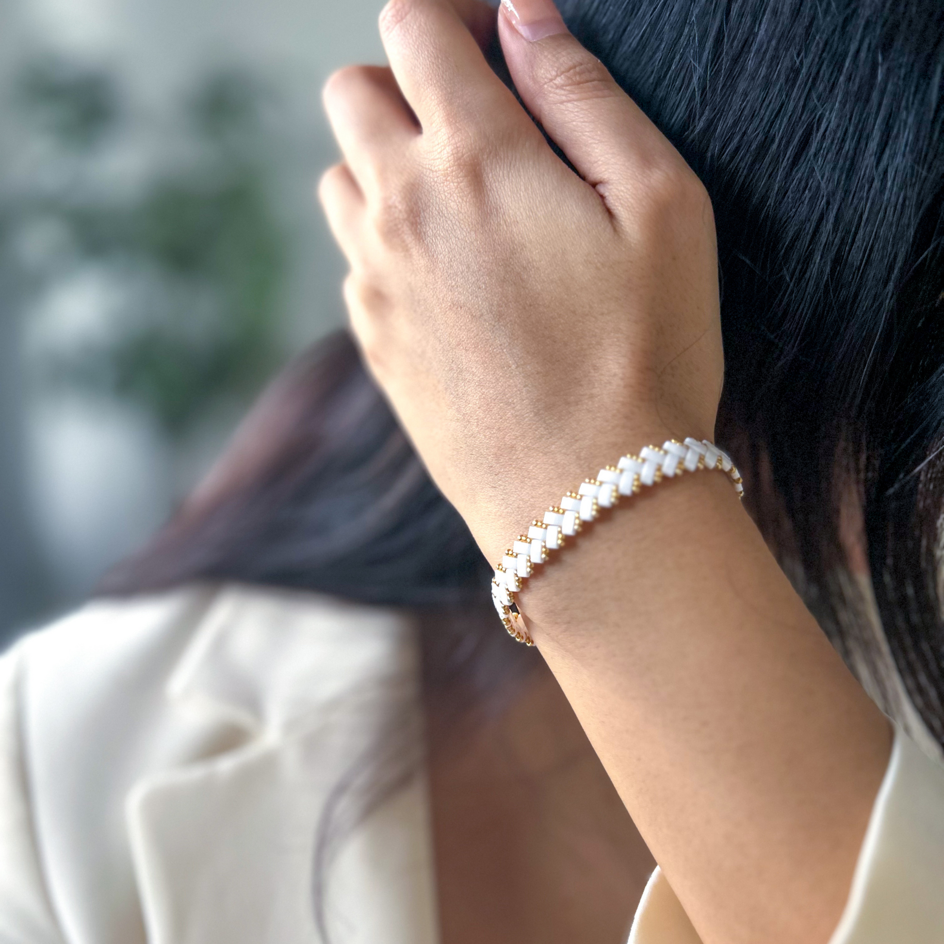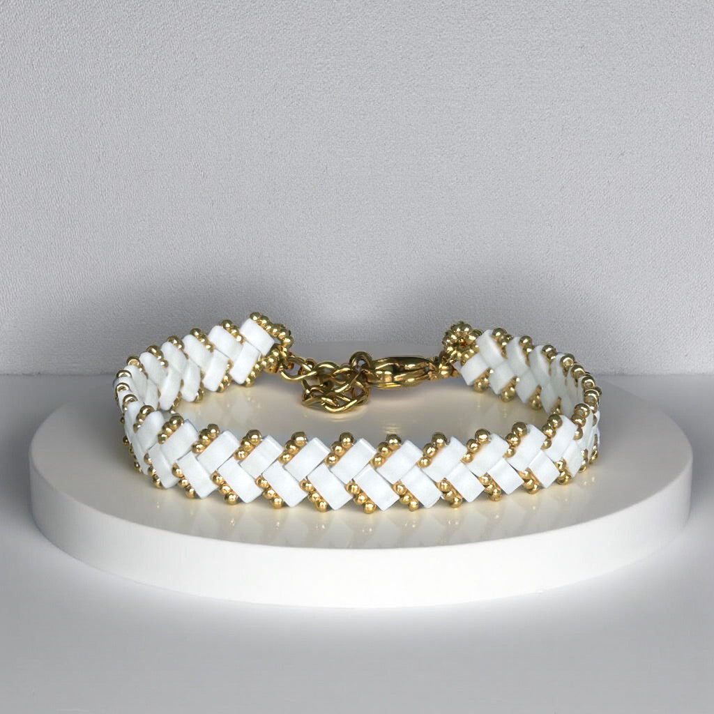 Lulu Thin Beaded Bracelet is an elegant thin bracelet combines white and gold tones for a timeless and refined look. Lightweight and versatile, it’s perfect for adding a touch of subtle sophistication to any outfit.