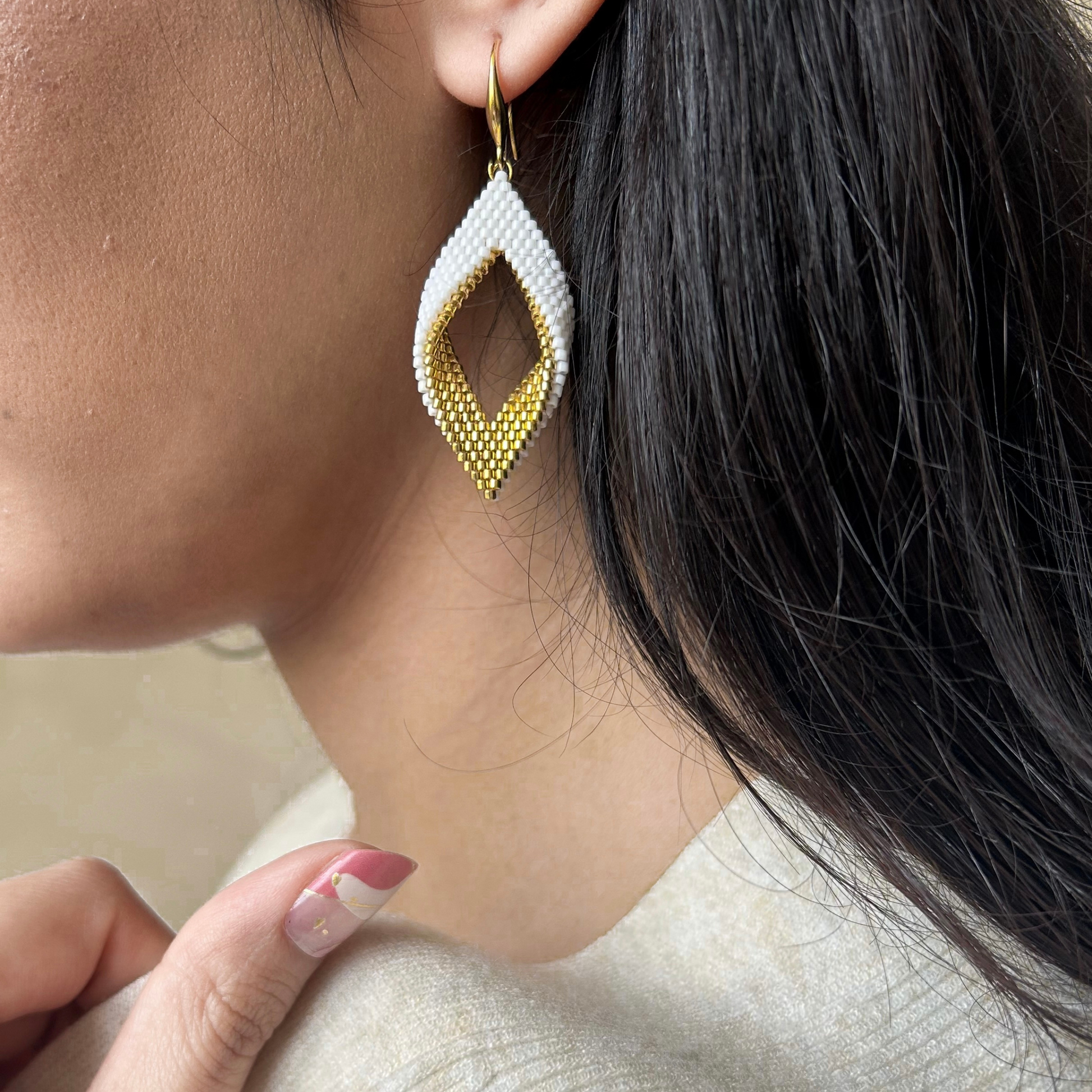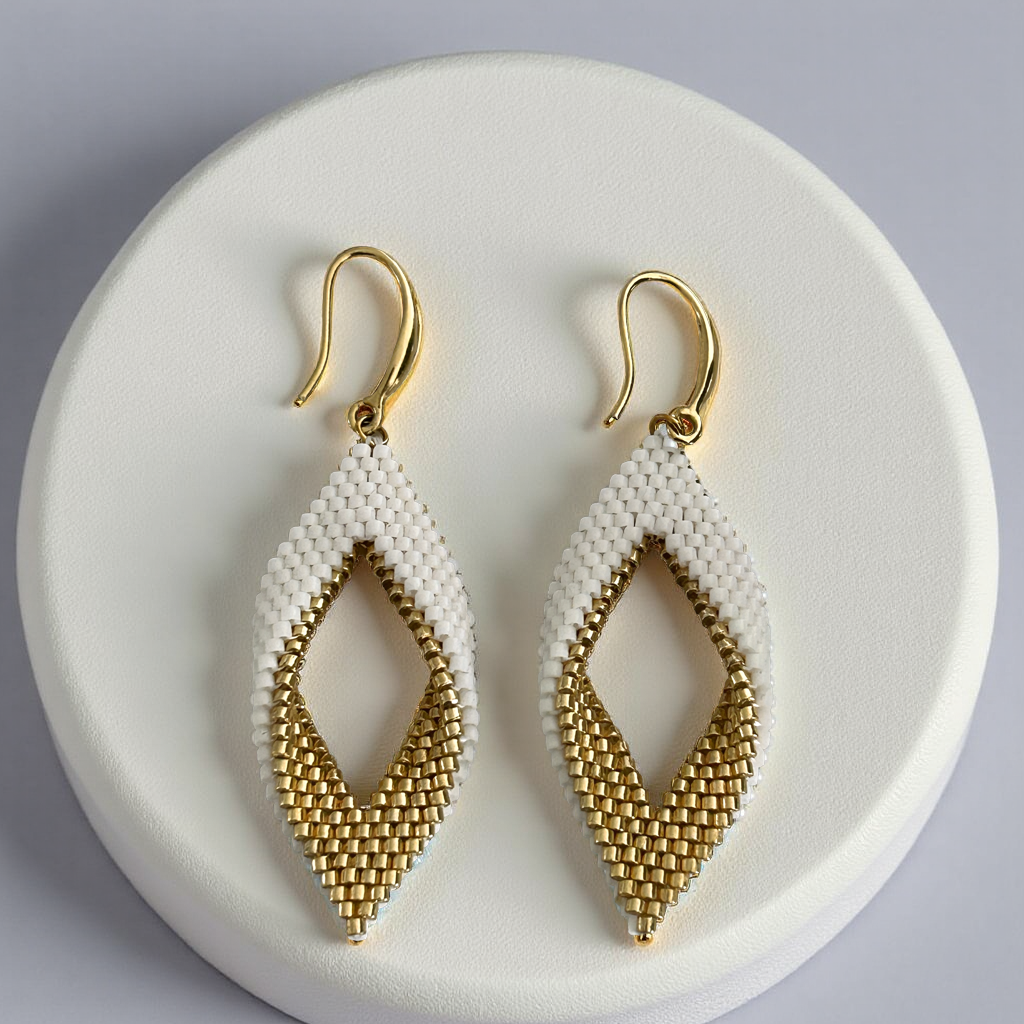Lulu Twist Woven Earrings are made of high-quality white gold beads, ensuring a durable and stylish piece of jewelry. Its intricate crochet design adds a touch of elegance to any outfit. Perfect for a formal occasion or as a statement piece, this bracelet is a must-have for any jewelry collection.