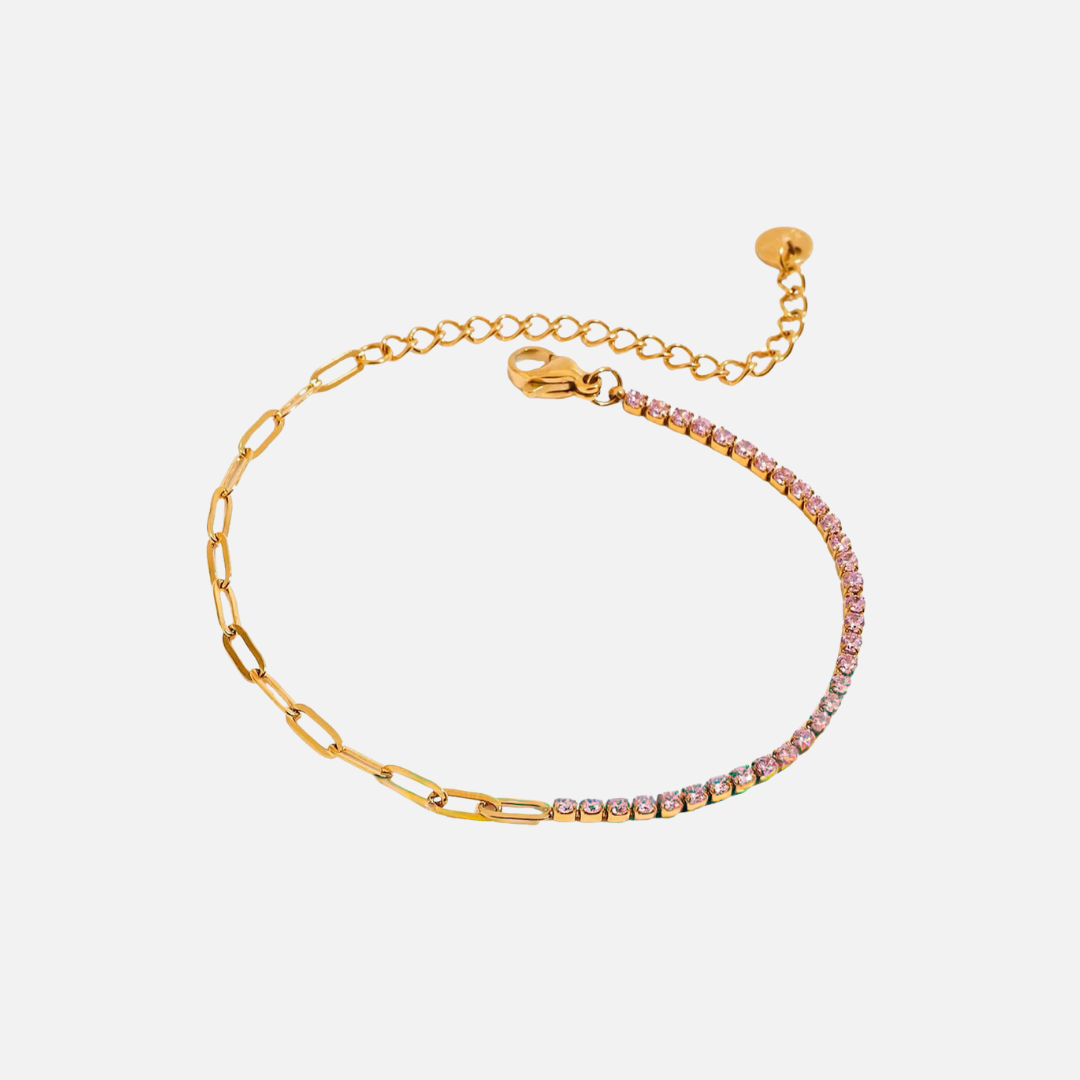 This modern take on the classic tennis bracelet features a striking contrast—half lined with pink stones, half finished with a sleek gold chain. Bold yet balanced, it’s a standout piece that brings together color and shine in a fresh, contemporary design.