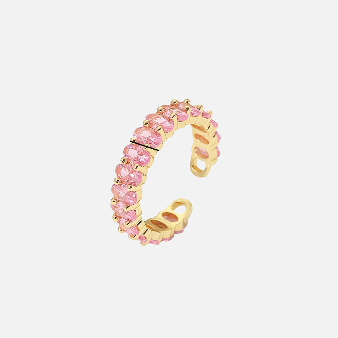 This sleek gold ring features a single band lined with vibrant pink crystals, offering just the right amount of sparkle and color. Effortlessly chic, it’s the perfect accessory to add a fresh pop to your everyday stack or a subtle statement to a dressier look.