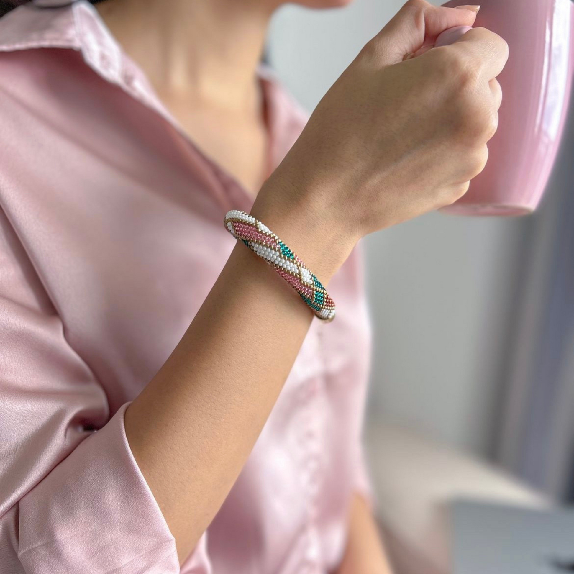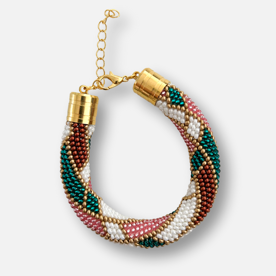 Your beadwoven jewelry is crafted from countless tiny, high-quality glass beads, sewn together. To keep it in pristine condition, handle it with care, avoid contact with hard surfaces, and gently wipe it with a non-alcohol wipe or a jewelry cloth to maintain its shine.