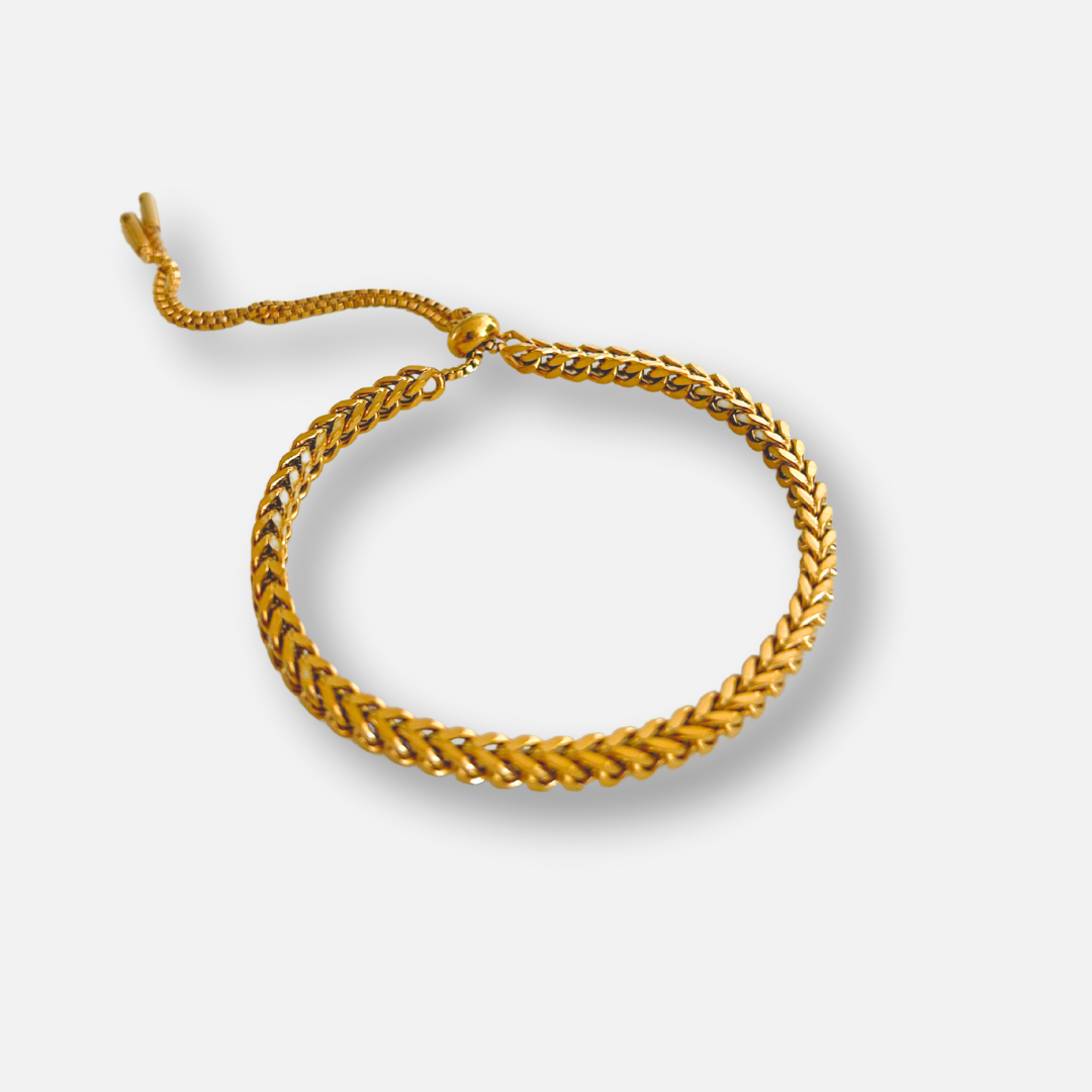 This thin gold bracelet features a delicate, elegant design, making it the perfect accessory for adding a subtle touch of sophistication to any outfit. Ideal for layering or wearing on its own.