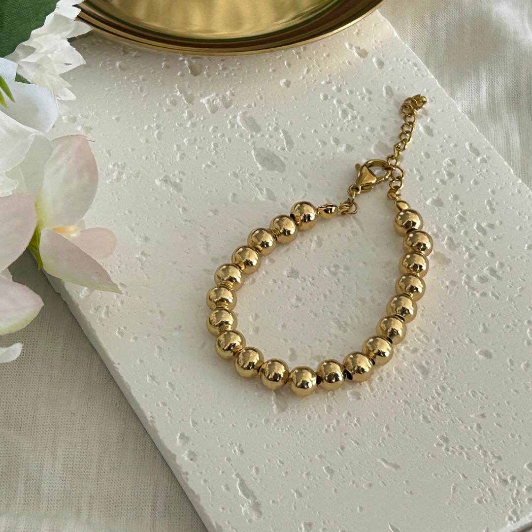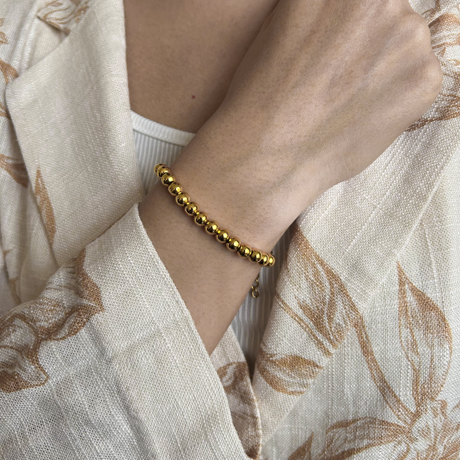 Thick Gold Ball Bracelet is made of high-quality gold beads, ensuring a durable and stylish piece of jewelry. It adds a touch of elegance to any outfit. Perfect to be worn on it's own or to stack with other bracelets, this bracelet is a must-have for any jewelry collection.