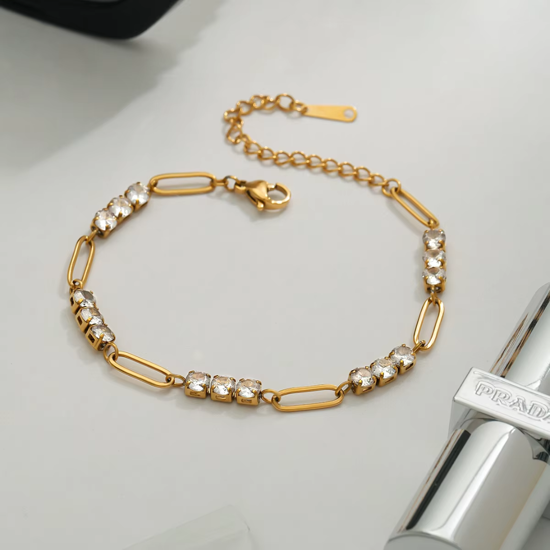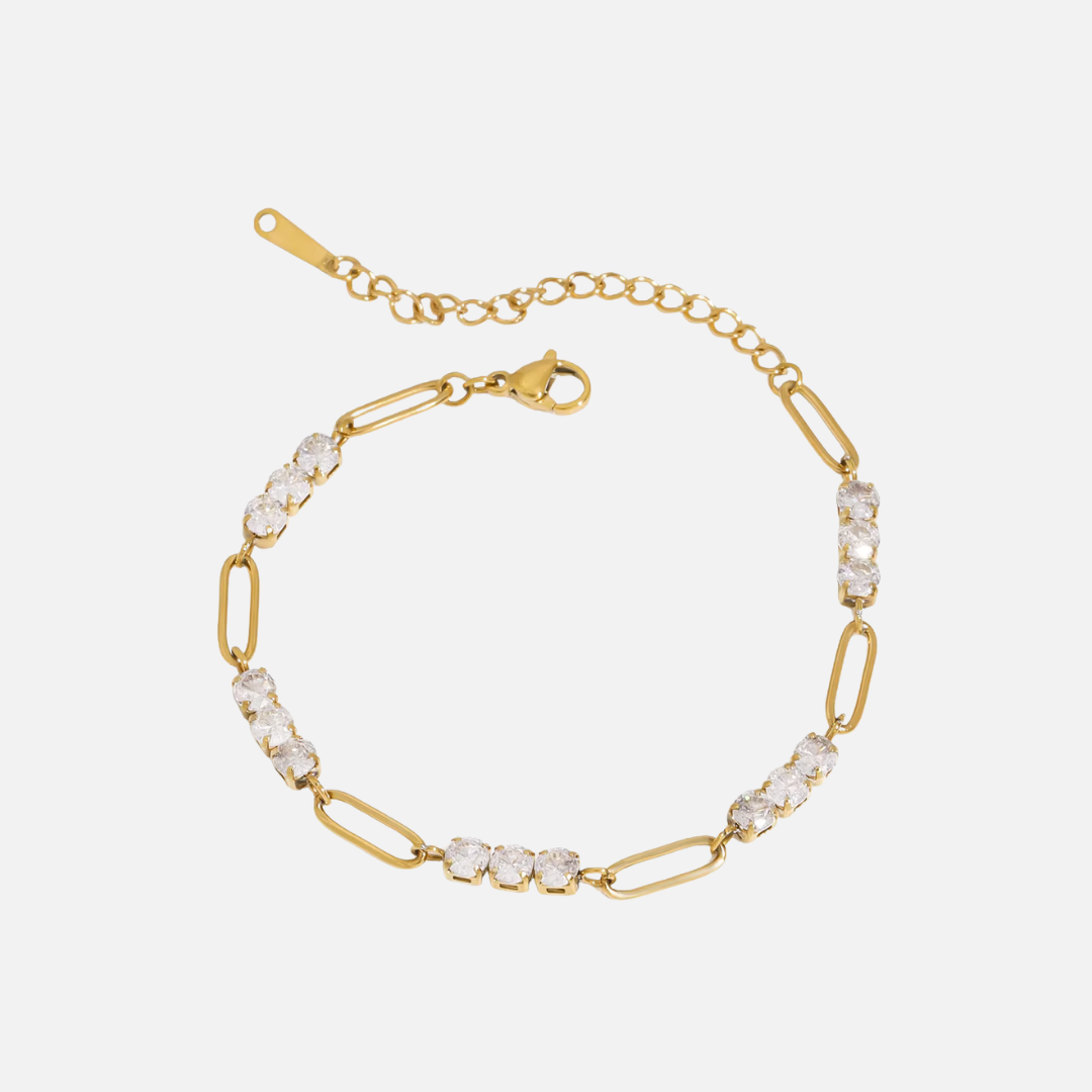 A modern twist on the classic tennis bracelet. The Twilight Bracelet pairs dazzling stones with a sleek gold-plated chain, striking the perfect balance between elegance and edge. Ideal for stacking or wearing solo.