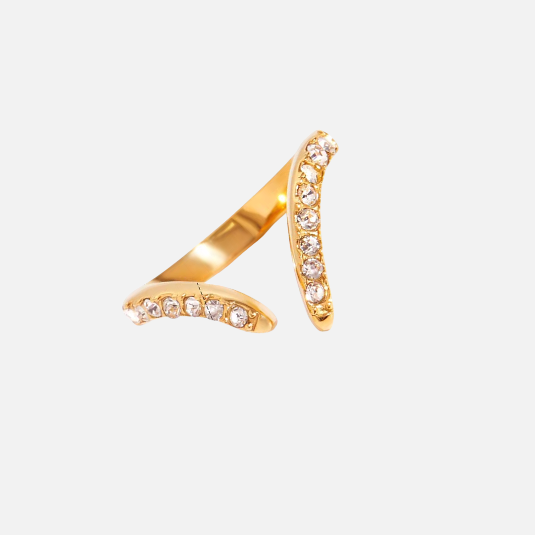 Clean and modern, this V-shaped gold ring is set with fine cubic zirconia for a subtle hint of sparkle. Its open, adjustable band offers a comfortable fit, making it an easy everyday piece that pairs effortlessly with any stack or stands out on its own with understated elegance.