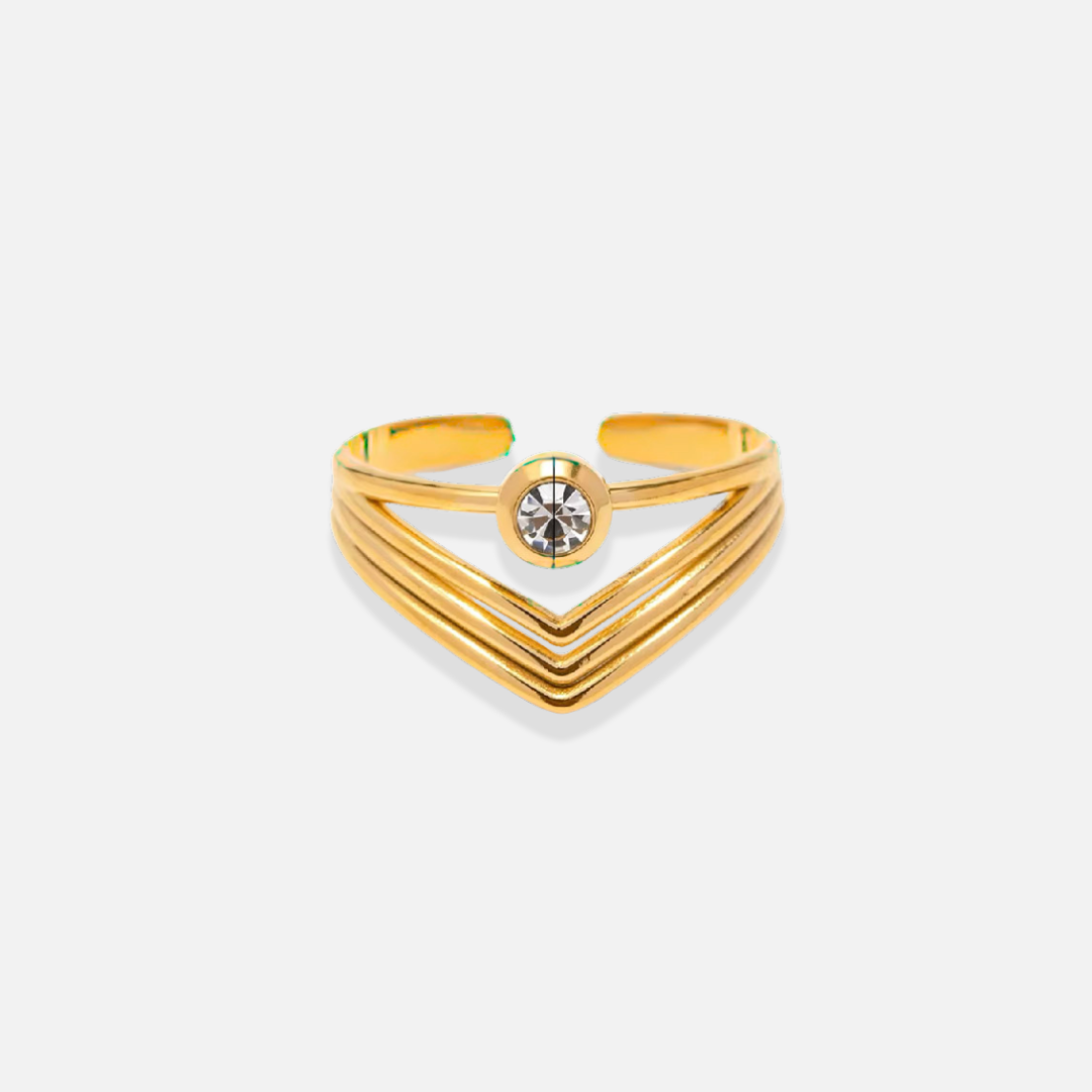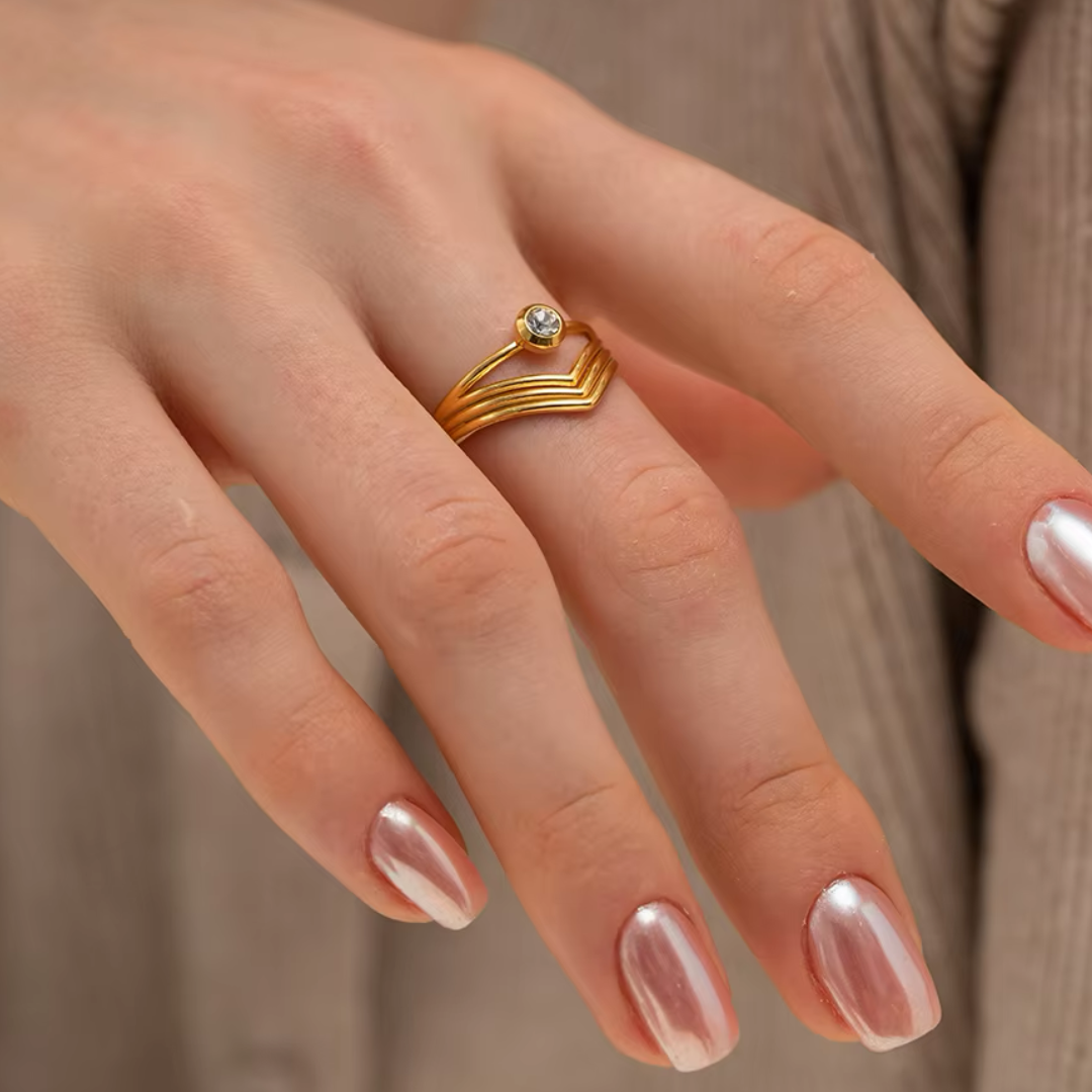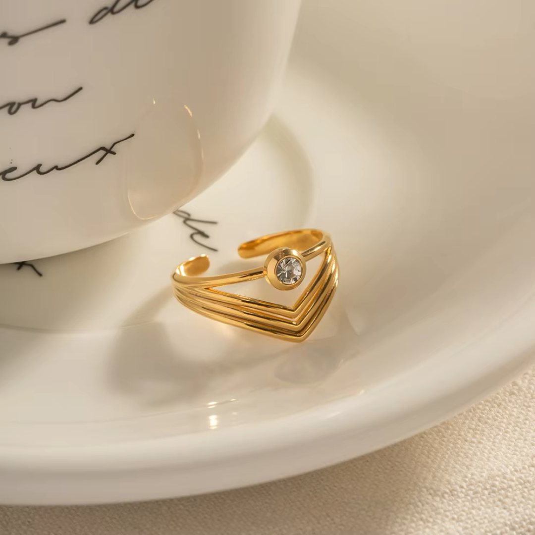 Delicate and distinctive, this V-shaped ring is accented with a single sparkling cubic zirconia at its point. Minimal yet elegant, it’s perfect for stacking or wearing solo as a subtle statement of modern sophistication.