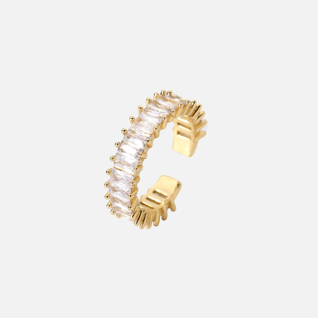 This elegant ring features a sleek gold band fully lined with shimmering crystals, creating a continuous row of sparkle. Refined yet eye-catching, it’s a timeless piece that adds just the right touch of shine to your everyday stack or special occasion look.