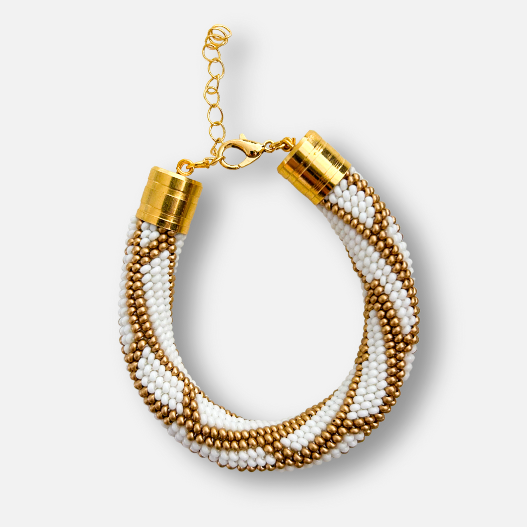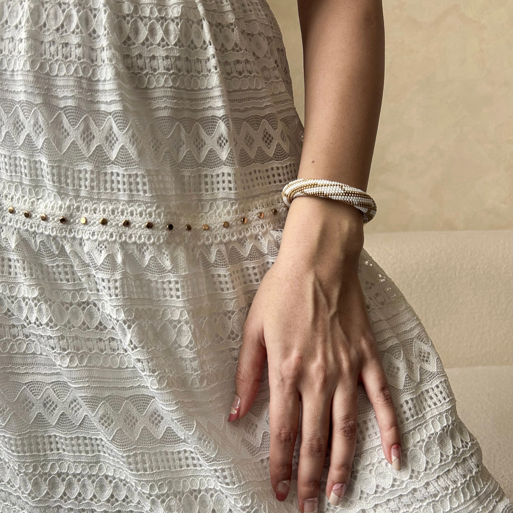Diani Woven Bracelet is made of high-quality white gold beads, ensuring a durable and stylish piece of jewelry.