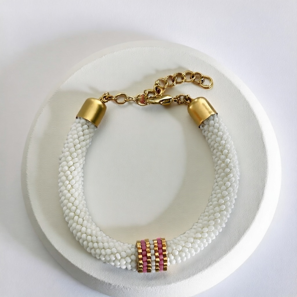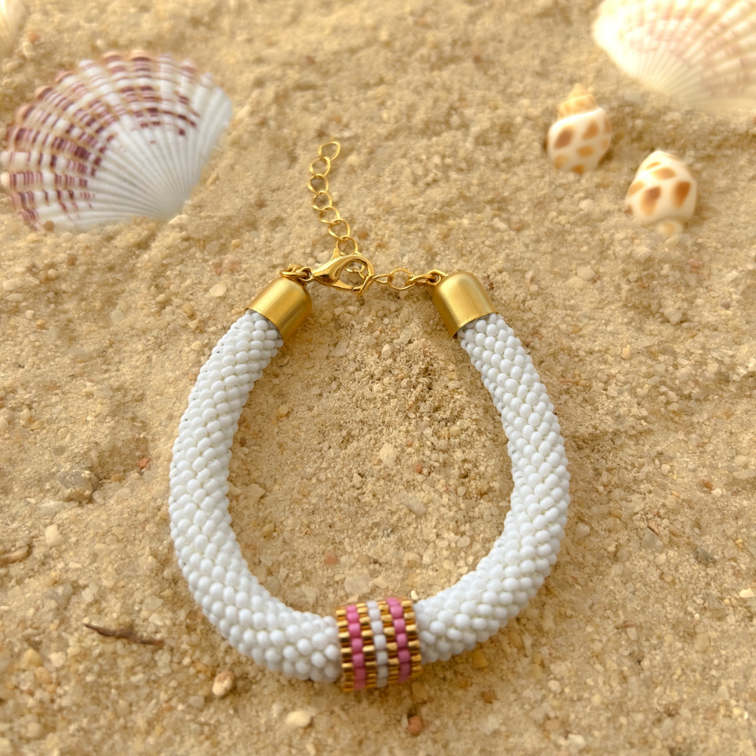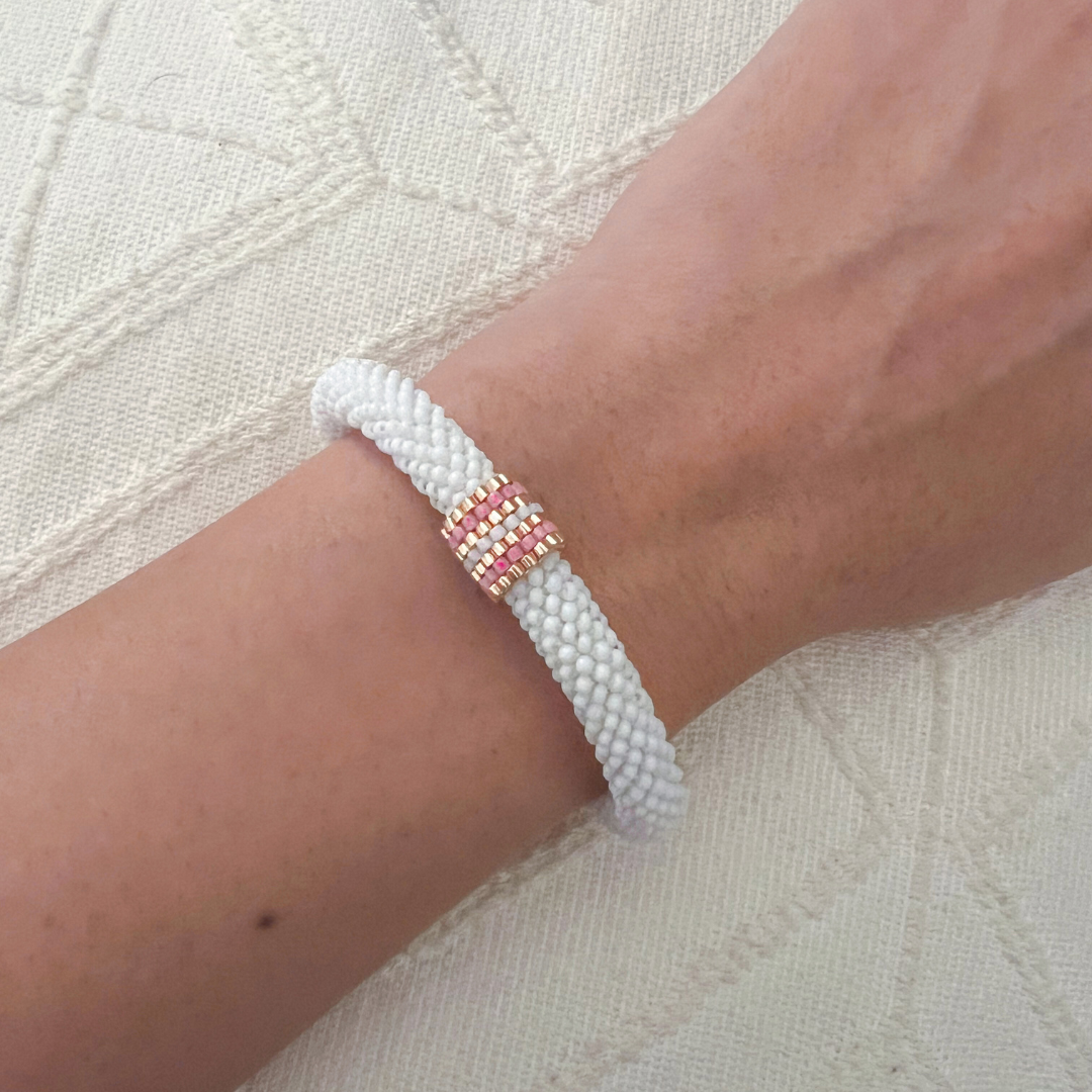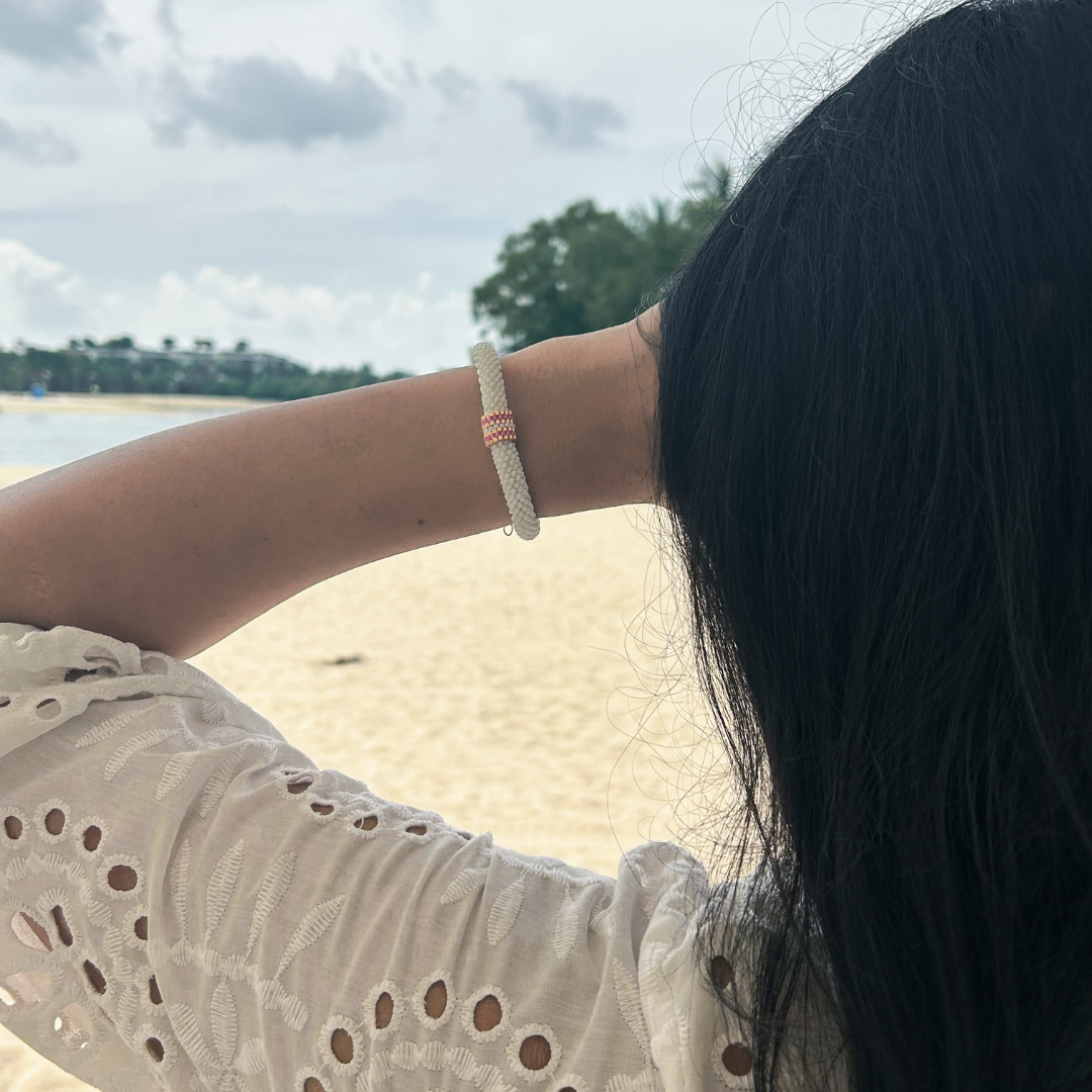 Kigali Mini Woven Bracelet is a refreshing white-colored woven bracelet with a splash of pink.