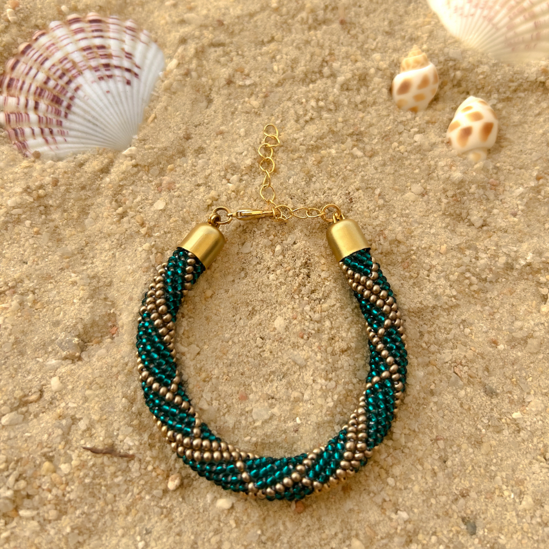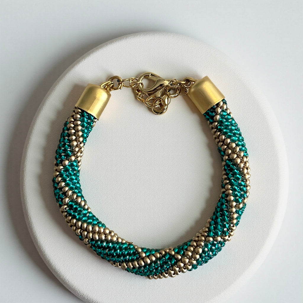 Your beadwoven jewelry is crafted from countless tiny, high-quality glass beads, sewn together. To keep it in pristine condition, handle it with care, avoid contact with hard surfaces, and gently wipe it with a non-alcohol wipe or a jewelry cloth to maintain its shine.