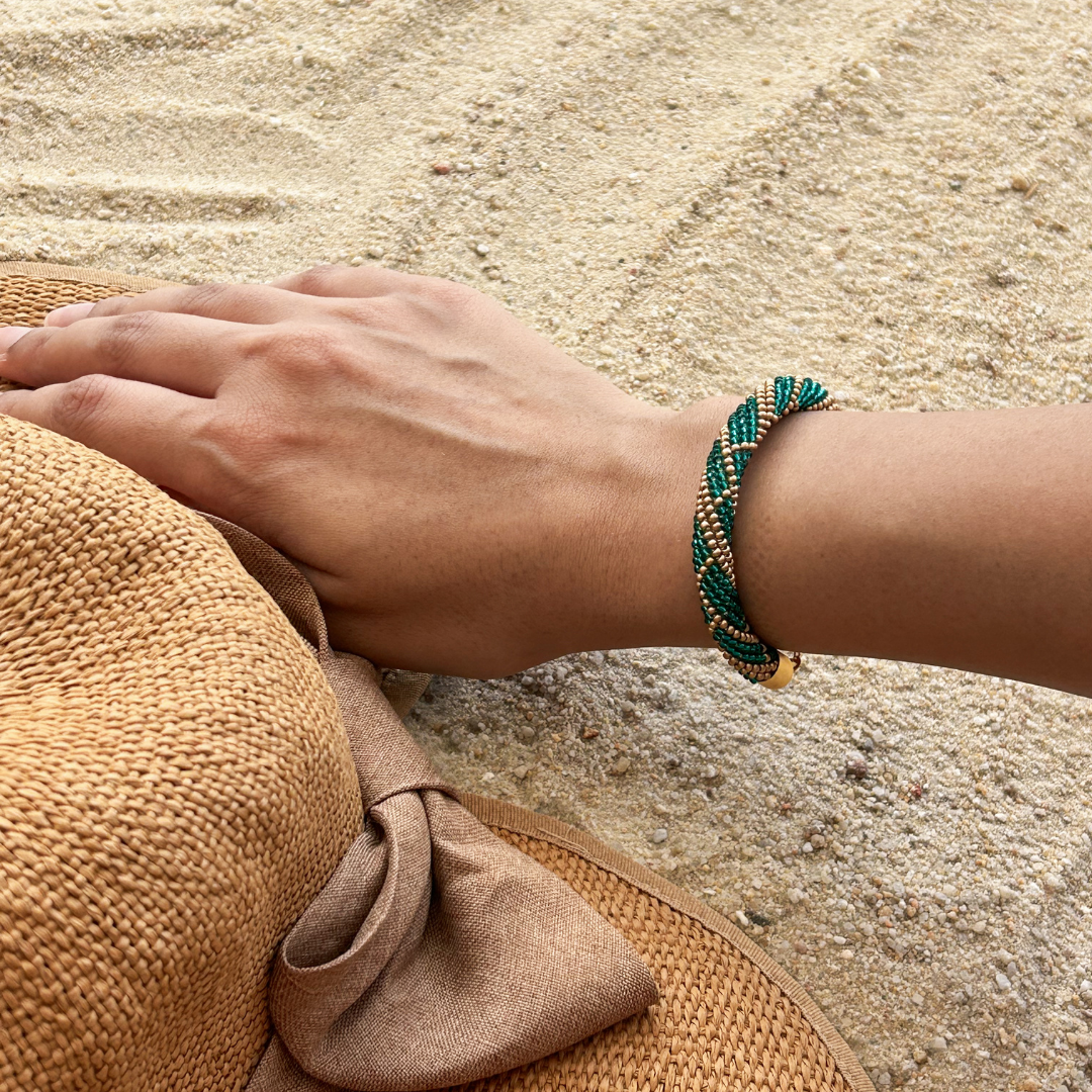 Nyasi Mini Woven Bracelet is a playful woven bracelet in gold and green hues, perfect for adding a pop of color to any outfit.